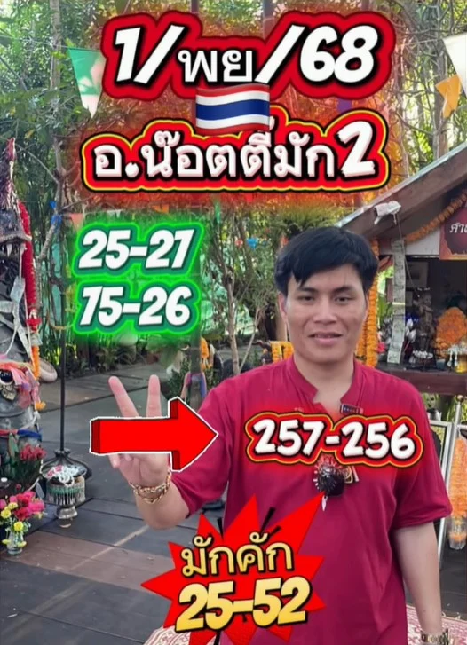 จากแนวทางที่ “อ.น้อตตี้” ปล่อยมา จะเห็นว่า เลข 2 เด่นแรงเป็นพิเศษ ขณะที่คู่เลข 25 – 52 ถูกจับตามองว่าอาจมาแรงในงวดนี้ เนื่องจากเป็นเลขกลับที่มีพลังเสริมกันในทางมงคล และยังไปพ้องกับเลข ประจำเดือนพฤศจิกายน (เดือน 11) ที่มีแนวโน้มเข้าคู่เลข “2–5” ได้ดี